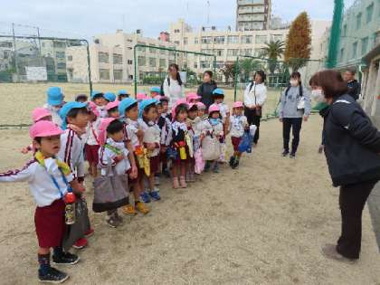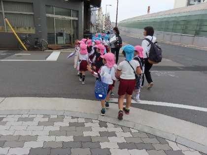 九条北小学校の運動場をお借りするため、5歳児そら組と4歳児はな組で手をつなぎ、みんなで出かけました。