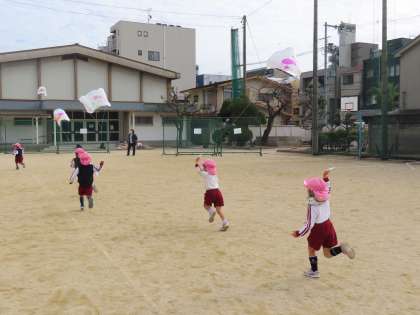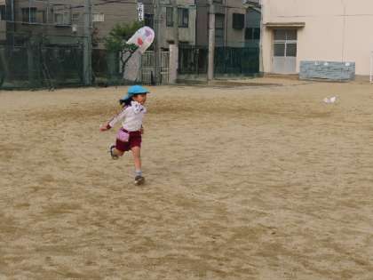 園庭ではなかなか凧糸を長くのばせないけれど、「もうちょっと」「もうちょっと」と、のばし、高くあがるのを楽しみました。