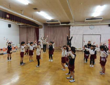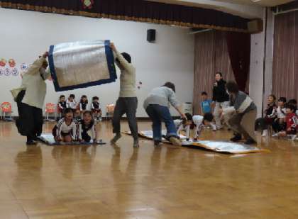 『にんじんさんがあかいわけ』のパネルシアターをみたあとは、お家の方と一緒に、ダンゴムシ競争です。5歳・6歳になった誕生児ですが、まだまだハイハイは速い速い! お家の方々が一生懸命、道をつくってくれました。そして、最後は、みんなで体操をしました。