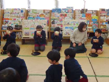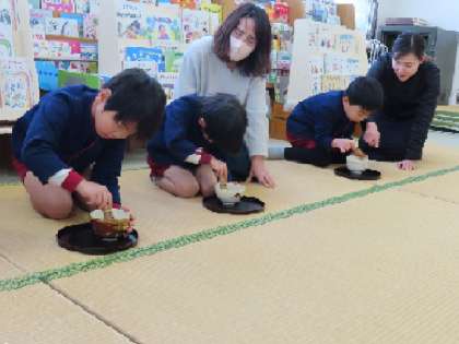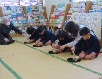 お茶を点ててみると、「たてたて(縦)」と茶筅を動かすのは、思ったより難しい様子。お茶碗を抑えて真剣です。最後にお椀の中で、「の」の字を書いて出来上がり。自分で点てたお茶は、とてもおいしかったそうです。