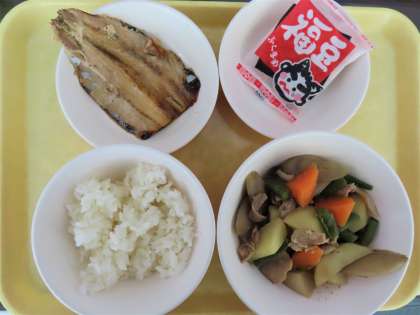 午前中に、豆まきをした子どもたち。子どもによっては、イワシに少してこずりながらも、節分献立を頑張って食べていました。いり豆は、「豆まきをしたやつ!」と喜び、喉に詰まらせないように気をつけながら、よく噛んで、味わっていました。
