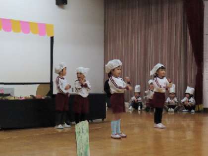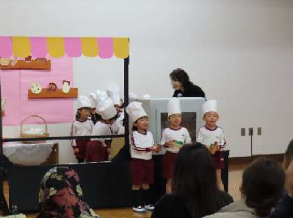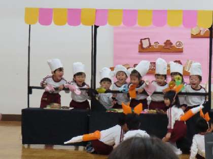 いろいろな動物になって遊ぶことや、パンをつくったり、お店やさんになったりすることなど、物語に親しみ、自分なりに表現することを楽しんできた様子を見ていただきました。