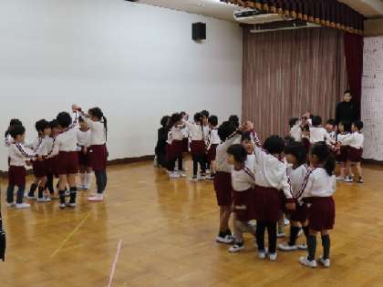 手をつなぎ、向かい合い、歌いながら遊ぶ楽しさを、存分に味わっています。『なべなべそこぬけ』は、どんどん人数を増やし、うまくいくかどうか、ドキドキしたけれど大成功!