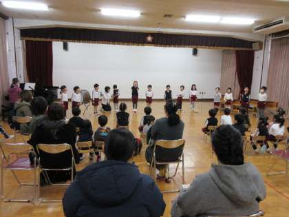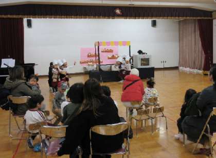 4歳児はな組は、『ゴリラのパンやさん』の劇遊びを、5歳児そら組は、歌と合奏を、それぞれみてもらいました。小さい友達に拍手をしてもらい、嬉しそうでした。