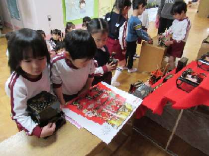 4歳児はな組は、お道具を見ながら、「これ何する物?」「牛が引っ張ってる」「ご飯食べるやつや!」など、昔の道具の形や使い方を知って、びっくりしたり感心したり。写真を見て、どこに飾るか考えながら、並べました。