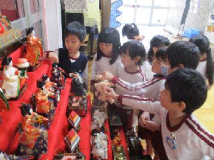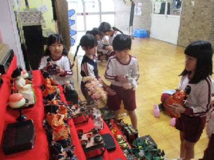 もうすぐひな祭り。みんなで雛人形を飾りました。