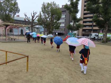 雨の降る中、傘をさして行きました。道の端を、並んで上手に歩いていました。もうすぐ1年生ですもんね。