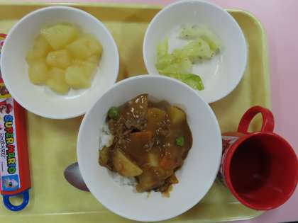 今日の献立は、ハヤシライス、キャベツのバジル風味サラダ、洋ナシ(カット缶)でした。おいしくいただきました。