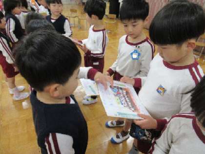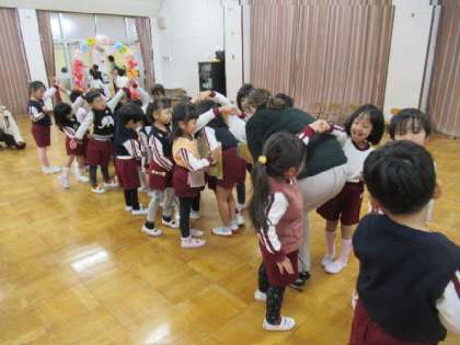 お別れ会 5 公開日 2024/03/06 更新日 2024/03/06 子どもたちの様子 最後に、プレゼントを渡しました。5歳児そら組に喜んでもらって、4歳児はな組も嬉しそうでした。 一緒に『お別れ会のうた』を掛け合いで歌って、そら組の子どもたちが、お礼に『またね』の歌をうたってくれました。 見送りは、はな組のみんなが手をつないでつくったトンネルを、そら組のみんながくぐりました。楽しかったね。 あと何日一緒に遊べるかな?いっぱい遊びましょう。 いいね(0)