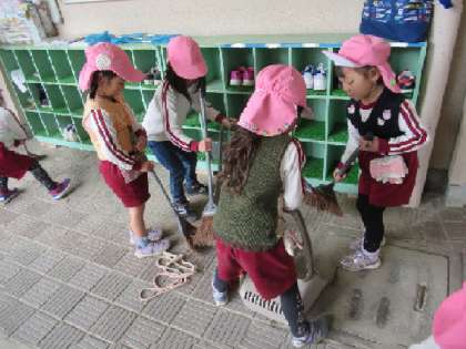 まずは、掃除です。「『わぁ、きれい』ってそら組さん、喜ぶかな」「掃除したの内緒にして、びっくりさせよう」と、テラスやそら組の靴箱の中まで、きれいに掃きました。後で、そら組の子どもたちが、「はな組さん、きれいにしてくれて、ありがとう」と言ってくれて、満足気でした。
