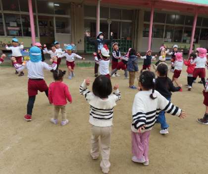 4歳児はなぐみや、預かり保育に参加している5歳児たちと、園庭開放で一緒に遊んだあと、手洗いをして遊戯室へ。