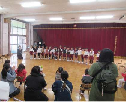 そして、はな組の子どもたちが、新しいお友達にプレゼントしたいと、つくったペンダントと歌をプレゼント。「幼稚園で一緒に遊びましょう、待ってるよ〜」と伝えて、トンネルをつくって見送りました。