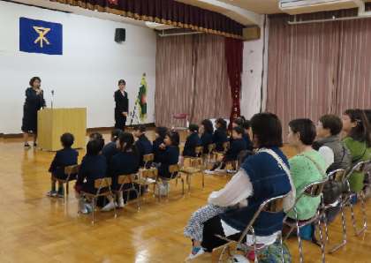 新しい先生を知って、少し緊張しながらも、「よろしくお願いします」ときちんと挨拶。転任された先生からのお祝いのメッセージをよんでもらって、またニコニコ。