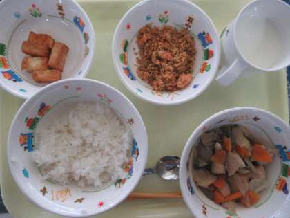 今日のメニューは、鶏肉トジャガイモの煮物 厚揚げのしょうゆだれかけ 紅鮭そぼろ ごはん 牛乳でした。ごちそうさまでした。