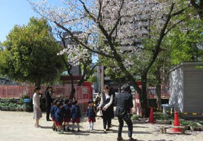 新入園児のみんなが、お家の方とやってくるのを、5歳児そら組の子どもたちがお出迎え。「おめでとうございます!」とお祝いを伝えたり、名札を探してあげたりしていました。