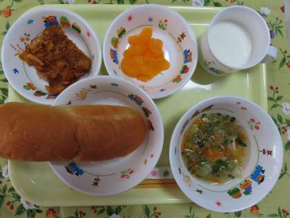 じゃがいものミートグラタン レタスのスープ みかんのかんづめ パン ぎゅうにゅう でした。