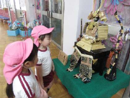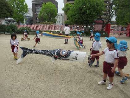 こいのぼりを出すと、さっそく、こいのぼりを連れて、園庭を散歩です。子どもたちと一緒に泳いでいるみたいで、とても楽しそうでした。
