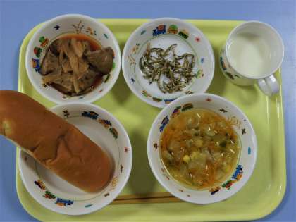 やさいスープには、キャベツ、コーン、にんじん、パセリがいっぱい入っていて色鮮やか。野菜たっぷりです。ミニフィッシュ、おかわりしたい子どもがたくさんいました。