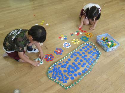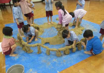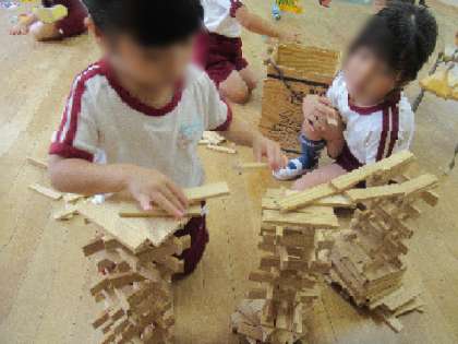 1学期、大阪・関西万博への園外保育に期待をもち、土粘土、カプラ、ブロックなど、いろいろな素材で、いろいろな大屋根リングをイメージして、つくって遊びました。