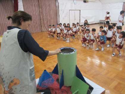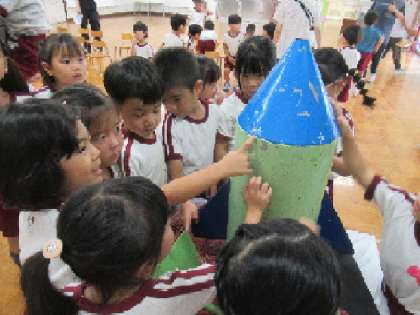 飾ってあるタイムカプセルにも興味津々で、『2021』とかかれているのを見て、「今『2025』や!」「ここにミャクミャクかこう!」「中にパビリオンつくって入れる?」など、今年度95周年記念として、タイムカプセルに何を入れようか、早速考えていました。今から楽しみですね!