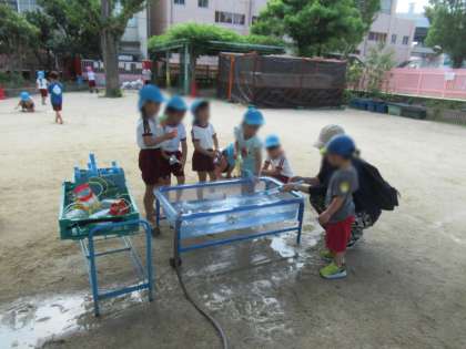 まだまだ暑い日が続いていますが、子どもたちは水遊びで元気いっぱい遊びました。
