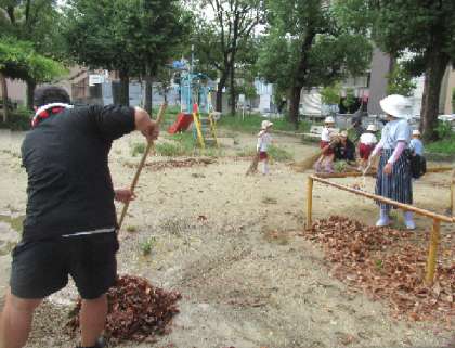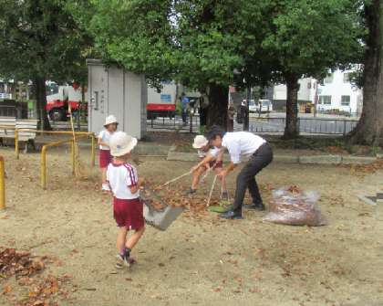5歳児そら組が、保護者と一緒に、隣接する九条東公園を清掃しました。
