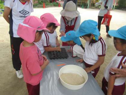前回のことを思い出し「種は一個ずつ置くんやんな」「優しく土のお布団かけるんやで」と、話をしながら蒔きました。