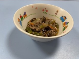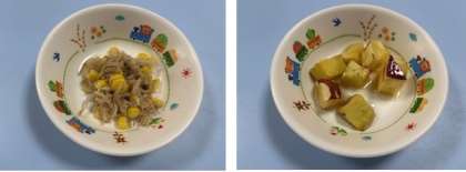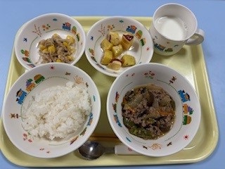 マーボーなすを好きな子どもが多く、何度もおかわりをする姿がありました。とても柔らかくて食べやすく、また、ナスを育てた子どもたちは、その話をしながらパクパク食べていました。サツマイモについては、今度芋ほりに行くのが楽しみになったようです。砂糖、塩、濃い口しょうゆで、おいしいあまみつがけになりました。