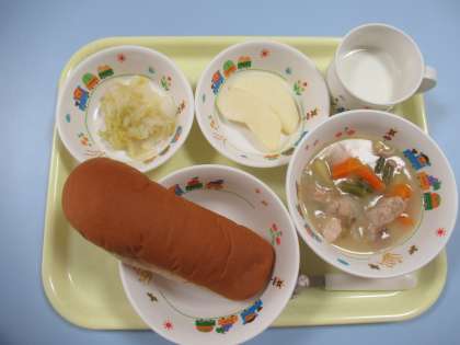 2日 … 鶏肉とサツマイモのシチュー 白菜のピクルス りんご 黒糖パン 牛乳
