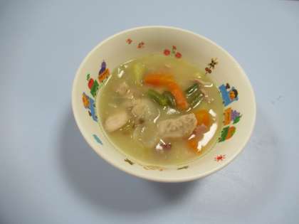 10月の給食初日のシチューには、いろいろな具が入っていました。鶏肉、ベーコン、サツマイモ、タマネギ、ニンジン、サンドマメ、マッシュルーム… スプーンで食べている子どもが多いですが、中には、上手に箸でサンドマメなどをはさんで、「これ、食べられるねん」と言って食べている子どももいました。ワインビネガー、薄口しょうゆ、砂糖で味付けられたピクルスも好評で、おかわりしていましたよ。ごちそうさまでした