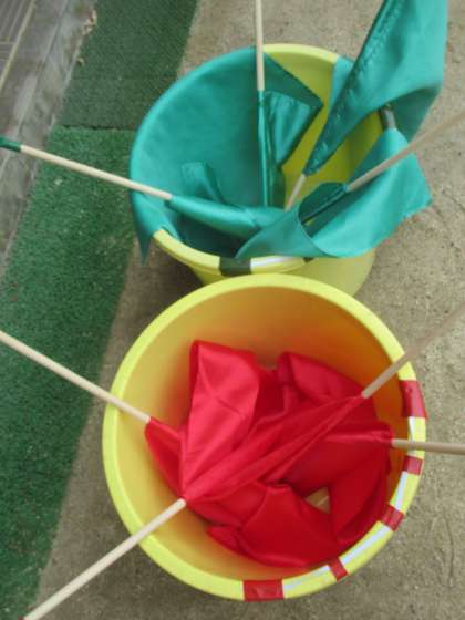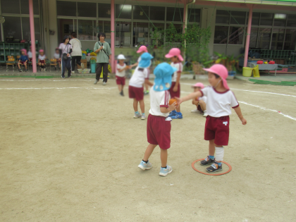 小さいお友達のかけっこのゴールに立つのは4歳児はな組。今日は、5歳児そら組が、大きいちっちゃいお友達、になってしてみました。ちょっと緊張しつつも、お土産を渡したいはな組の子どもたちは、ニコニコでした。未就園児のみなさん、お待ちしています!