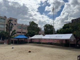 登園後、保護者の方々がテントを立ててくださいました。園庭が一気に運動会会場ぽくなってきました。当日が楽しみです!
