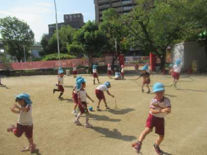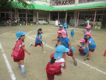 5歳児がしていた競技やダンス、リズムを、4歳児が「貸して」「よして」と入ってきて、一緒に楽しんでいます。リレーでは、5歳児がリードして、「ここに立って待つんやで」「バトンもらったら、走りや」と教えたり、玉入れでは、5歳児が『おじゃま虫』になって、難しくしたり、自然な関わりがうれしいですね。
