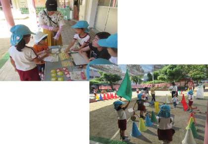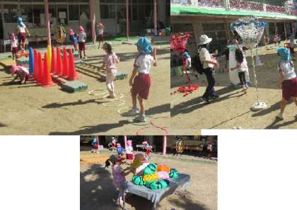 園庭では、玉入れをしたり、砂場で穴を掘ったり、4歳児はな組が並べてくれたコースを進んだり…フルーツ屋さんもオープンしていましたよ。