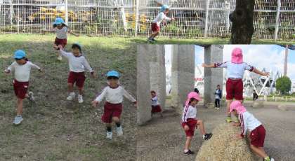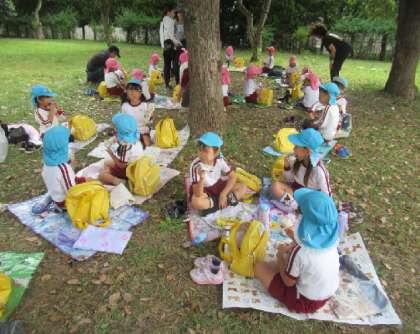 掘った芋を大事に持って、東花園ラグビー場の公園まで行きました。一生懸命、芋掘りした後のおにぎりは格別です。食べた後は、公園の中で草の斜面を走ったり、大きな石のある広場で遊んだり、キバナコスモスの咲く道を歩いたり・・・楽しく過ごしました。