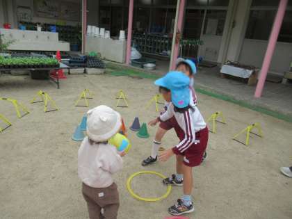 お祭りコーナーで遊んだり、砂場で大きな穴を掘ったり、どんぐりを転がして遊んだりしてたくさん遊びました。