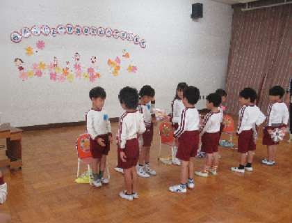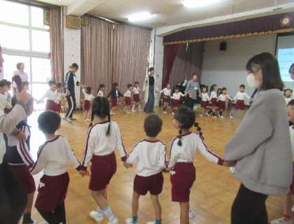 最後は、5歳児そら組が、音楽会で歌った『たこやきいっこ』の歌と手遊びをはな組に教えたり、『世界の国からこんにちは』の曲でみんなで踊ったりしました。