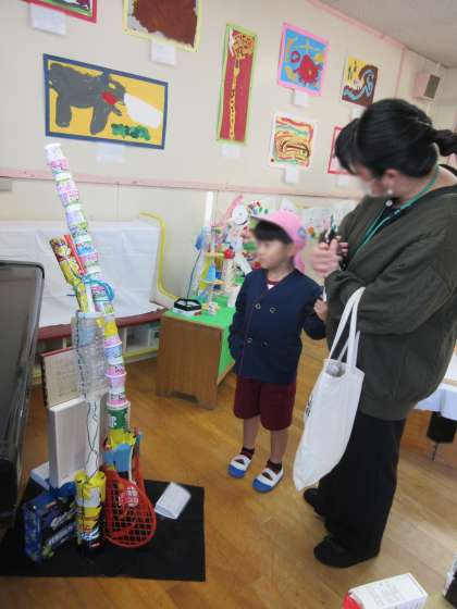 素材でつくったもの、絵や技法などをみながら、「ここには、〇〇があるねんで」「こっちは〇〇で、こうやってつくってん」など、楽しかったこと、おもしろかったことなども、お家の人に話していました。5歳児そら組の作品にも興味をもって、楽しんでみる姿がありました。