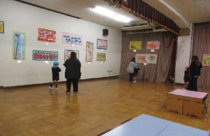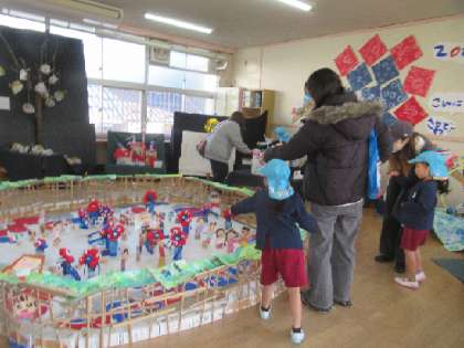 年長児そら組は、「早く見てほしい」という気持ちが強く、自分の作品を紹介しながら、「これは○○ちゃんの□□だよ。ここがこうなってね」と、友達の作品の紹介もたくさんしていました。つくっている過程や、工夫したところも、話をしていて、聞いている保護者の方も楽しそうでした。