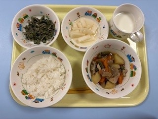 1日 … 鶏肉と野菜の煮物 じゃこピーマン かぶの柚子風味 ごはん 牛乳