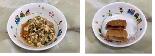 幼稚園では、ご飯の上にのせない方が食べやすい幼児もいるので、それぞれ別の皿で出してもらっています。