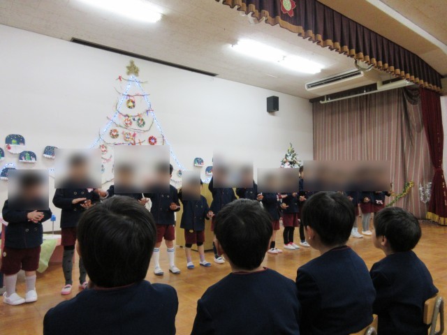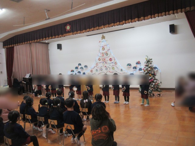 その後、4歳児はな組は「きらきらぼし」の楽器遊び・5歳児そら組は「さんたった」の楽器遊びと「さんたくろーすはどこだ」の歌を保護者の方々に見てもらいました。そら組は、五校園合同音楽会でみた、自分のと、隣の人のカスタネットを交互に鳴らすことをしてみたくて、みんなでやってみました。うまくいったかな?