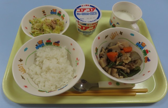 15日 ‥ 筑前煮 ツナとキャベツのごま炒め ヨーグルト ごはん 牛乳