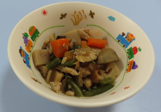 鶏肉、ニンジン、さんどまめ、しいたけ、れんこん、ごぼうが入っています。