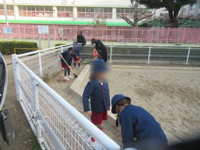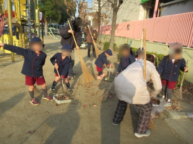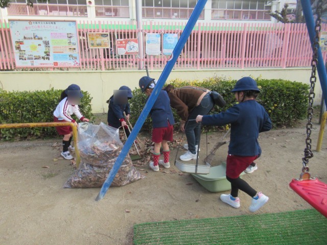 落ち葉を箒や熊手でかき出してみると、落ち葉の山ができるほど集まりました。ちりとりを持った友達を呼んで、一緒にビニール袋に入れていくと、あっという間に3袋がいっぱいになりました。いつも使っている大好きな公園がきれいになるのは気持ちがいいですね。保護者の皆様、朝早くから、ご協力ありがとうございました。