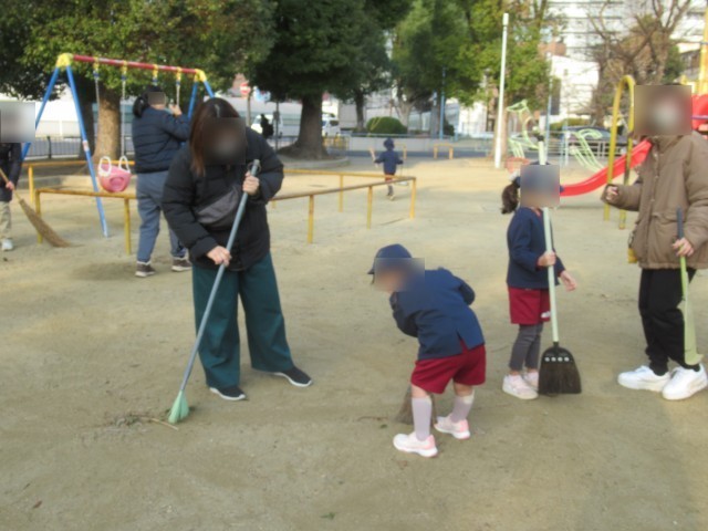 5歳児そら組が保護者と一緒に公園清掃をしました。一見きれいに見えたけれど、植え込みの陰に落ち葉がたくさん溜まっているのを子どもたちが発見!