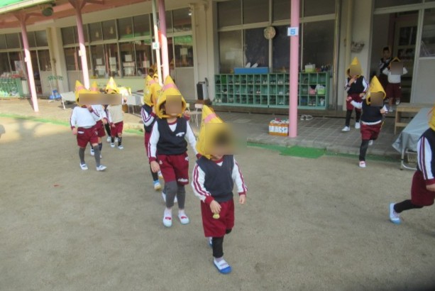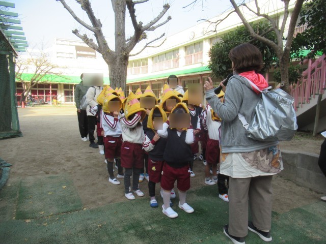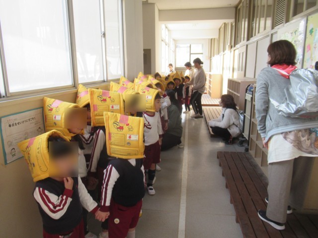 明日1月17日は、阪神淡路大震災があった日です。その日にどんなことが起こったか、話をして、避難訓練をしました。まずは、椅子や机の下に隠れて、大事な頭を守り、揺れが収まったら、園庭に一次避難をしました。火災が起き、その後、大津波警報が発令されたと想定して、隣接する九条東小学校に二次避難しました。4階までがんばって階段を上がり、津波に備えました。みんな静かに、約束を思い出しながら無事避難できました。