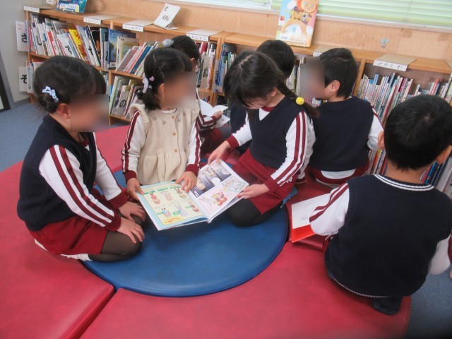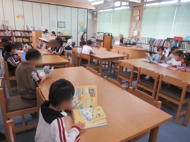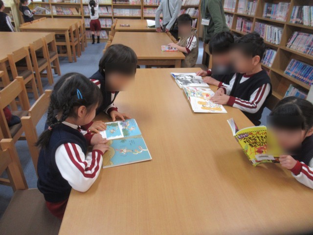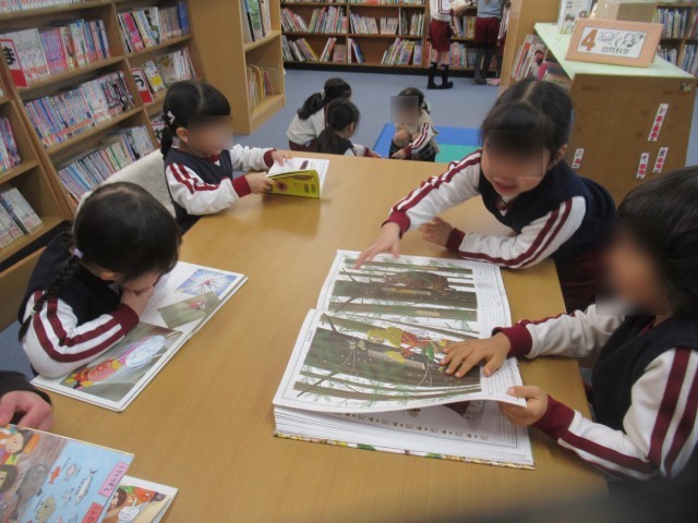 小学校の4階には、図書室があり、使わせていただきました。幼稚園と同じ絵本を見つけたり、少し字がたくさんある本を手にとってみたり、先生たちに「読んで」と本を渡してリクエストしたりしていました。いろいろなジャンルの本があるので、興味津々、あっという間に時間が過ぎました。自分でたくさんの本の中から好きな本を見つけて、興味をもって読むことができるのも育ちの一つですね。