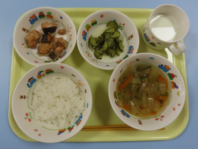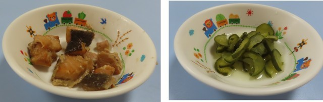 一口サイズの、鮭のつけ焼きを楽しんで食べていました。キュウリの甘酢和えは、いつも人気。何度もおかわりする子どもがいます。おいしかったです。ごちそうさまでした!