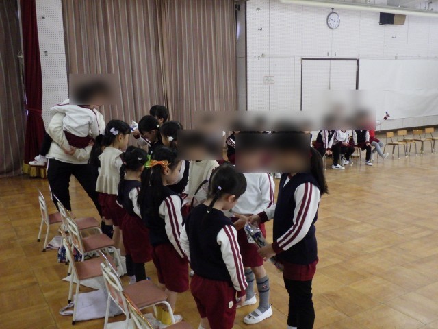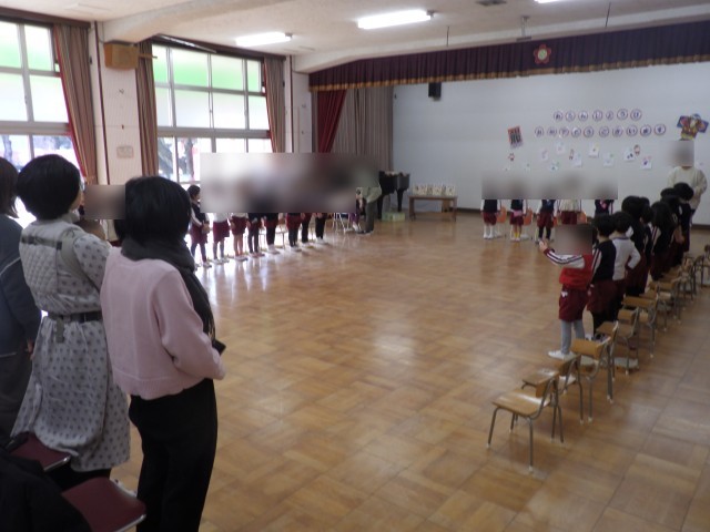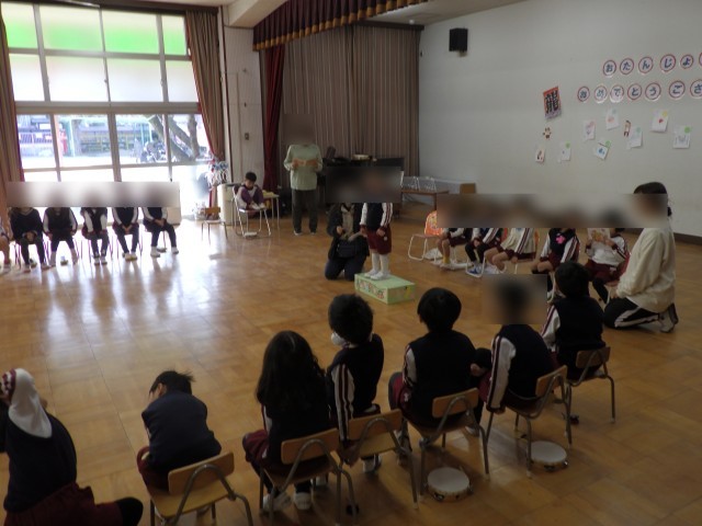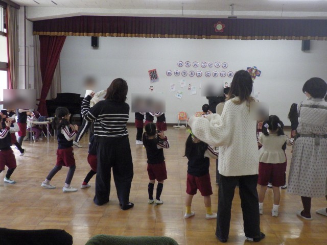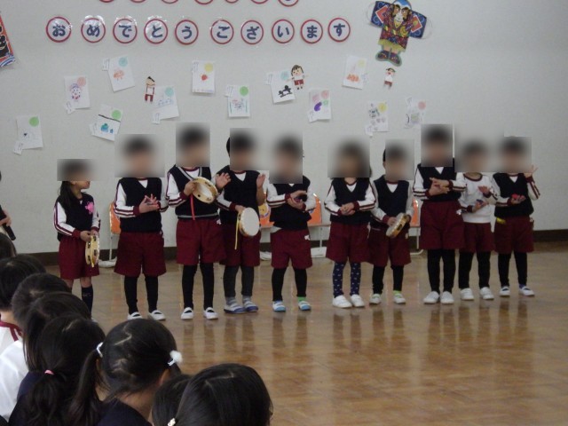 クラスごとに楽器遊びの見せ合いっこをして、最後は、みんなで『温泉第一』をして体を動かしました。